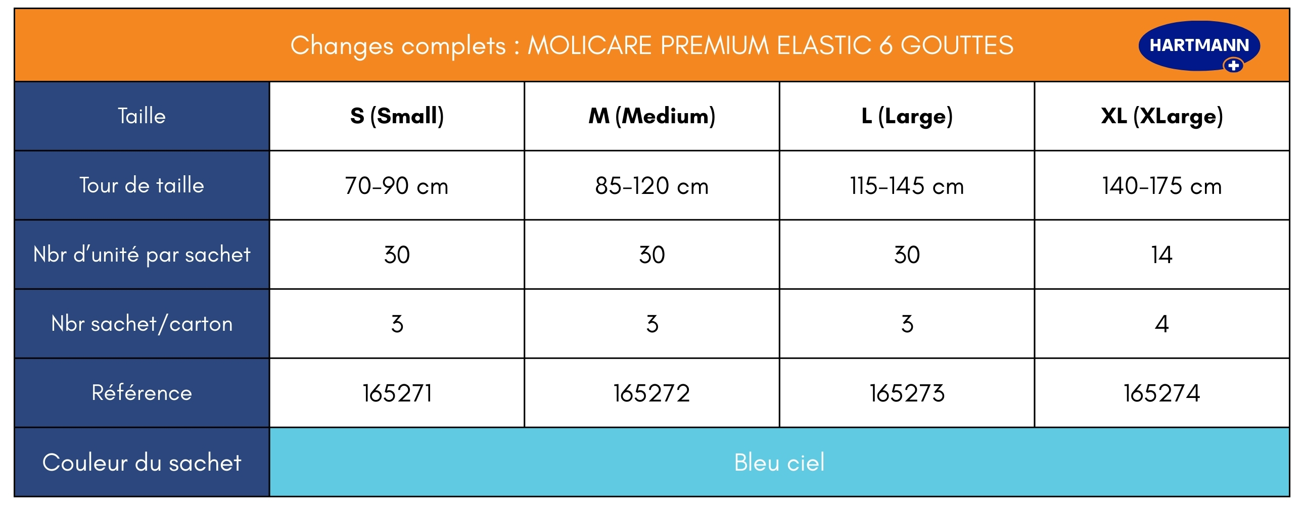 Pour faciliter votre choix au sein de la gamme Molicare Premium Elastic, nous vous proposons un tableau synthétique regroupant l'ensemble des niveaux d'absorption et des tailles proposées :