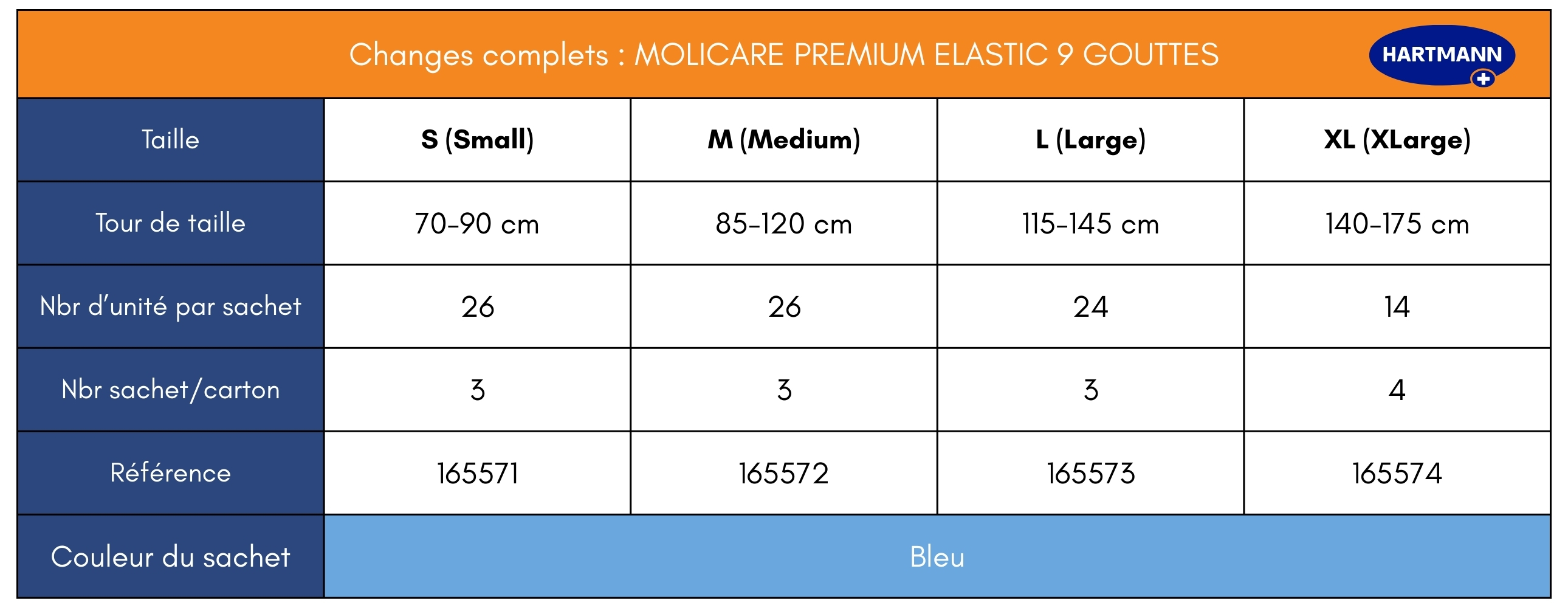 Pour faciliter votre choix au sein de la gamme Molicare Premium Elastic, nous vous proposons un tableau synthétique regroupant l'ensemble des niveaux d'absorption et des tailles proposées :